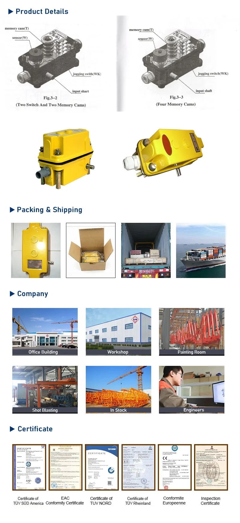 | We provide a good quality of product and constantly improve it. The limiters can be applied widely to the tri-dimensional control and the traveling limitation of the hoisting and conveying machinery in the construction of buildings, port ,mine, hydro-engineering construction, etc. |